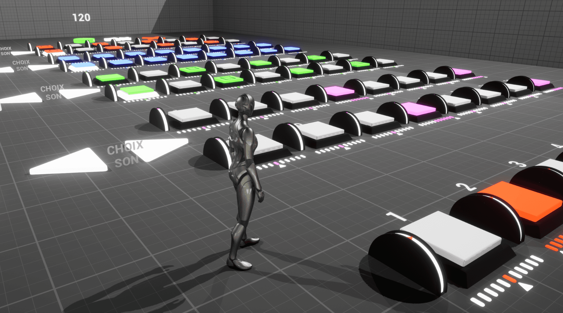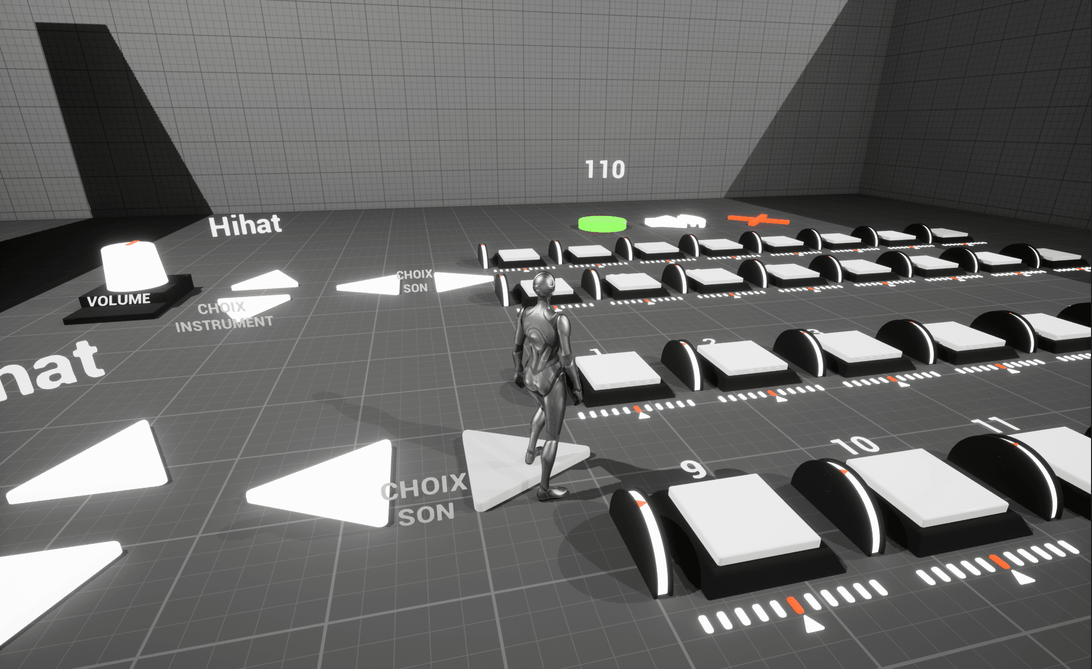 Ce projet est un step sequencer virtuel conçu sur Unreal Engine 5, émulant le fonctionnement d'une boîte à rythme ou d'un contrôleur MIDI. L'interface 3D offre la possibilité au joueur de composer des séquences musicales sur 16 temps en activant des touches afin d'y jouer le son associé.